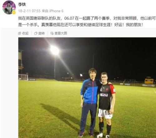 2018年冬训,当时李铁担任武汉卓尔主帅,率队在澳大利亚进行热身赛。第六场热身赛,武汉卓尔4-1击败卧龙岗狼队,李铁与谢菲联老队友尼克-蒙哥马利相逢,当时蒙哥马利还未退役,效力的正是武汉卓尔热身赛对手卧龙岗狼队。李铁在社媒晒出合照,他写道:“我在英国谢菲联队的队友,06.07在一起踢了两个赛季,对我非常照顾,他以前可是一个杀手。真羡慕他现在还可以享受和继续足球生涯!好运!我的朋友!”事实上,在谢菲联效力时期,蒙哥马利和孙继海也是队友。