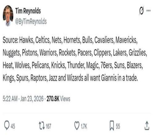 美联社知名记者Tim Reynolds就在报道中指出,如果字母哥进入交易市场,联盟中其余29支球队都对其有意,其中自然也包括火箭队。