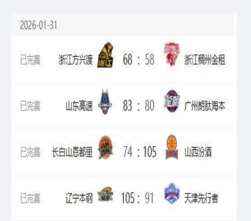 CBA常规赛,1月31日晚上共有4场比赛,其中浙江广厦队主场以68-58战胜浙江稠州队,山东高速男篮主场以83-80战胜广州龙狮队,辽宁队在主场以105-91战胜天津队,吉林队主场74-105不敌山西队。这4场比赛过后山东高速男篮的排名进入前4,辽宁队重回前10,排名前三的球队还是浙江广厦队、上海队和广东队。