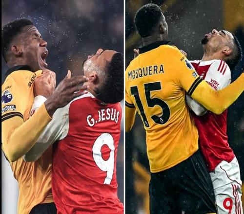 在这场跌宕起伏的英超平局赛后狼队与阿森纳的球员爆发了冲突,热苏斯本来倒地不起,听到终场哨响后跳起来和对手爆发肢体冲突。