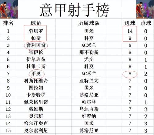 射手榜方面,劳塔罗14球领跑,帕斯9球位列第2。普利西奇,莱奥今天都没有进球,还是和霍伊伦,伊尔迪兹,杜维卡斯8球并列第3。图拉姆,佩莱格里诺,戴维斯等人7球刚好挤入前十。