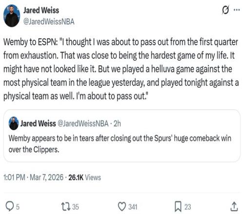 与此同时,文班也表示自己累坏了:“从第一节比赛开始我就累得快要晕倒了,这可能是我生命中最艰难的比赛之一,或许看起来不是这样,但昨天我们才对阵了联盟中身体对抗最激烈的球队,今晚的对手也是如此,我现在真的快要累垮了,接下来自己要好好睡两晚,相信自己很快就能够恢复过来。”