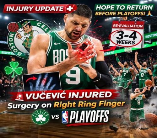 北京时间3月8日,波士顿凯尔特人队宣布,球队中锋尼古拉·武切维奇已经成功接受右手无名指手术,他在昨日比赛中遭遇手指骨折。球队表示,武切维奇将在3-4周后接受重新评估,这意味着他最快可以在常规赛末尾回归,这对于有望在今年季后赛冲击好成绩的凯尔特人而言是不幸中的万幸。