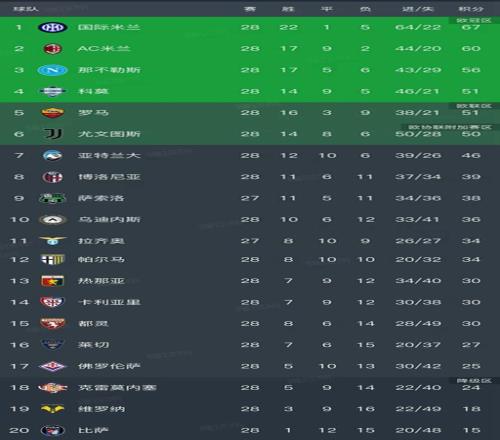 意甲最新积分榜