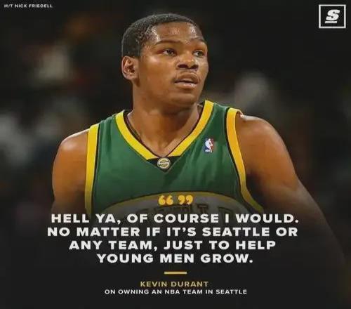 话说杜兰特本人不止一次在公开场合呼吁西雅图能够重新拥有一支NBA球队,甚至他愿意回归无论是以何种身份。