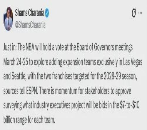 爆料王Shams:NBA将于3月24日至25日召开董事会会议,就在拉斯维加斯和西雅图两地新增两支球队的议题进行投票表决。