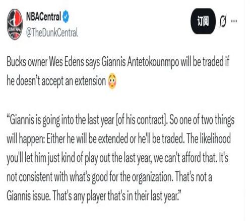 雄鹿老板韦斯-埃登斯接受ESPN采访时,明确表示下赛季为字母哥的准合同年(27-28赛季拥有球员选项),球队不可能承担如此风险。
