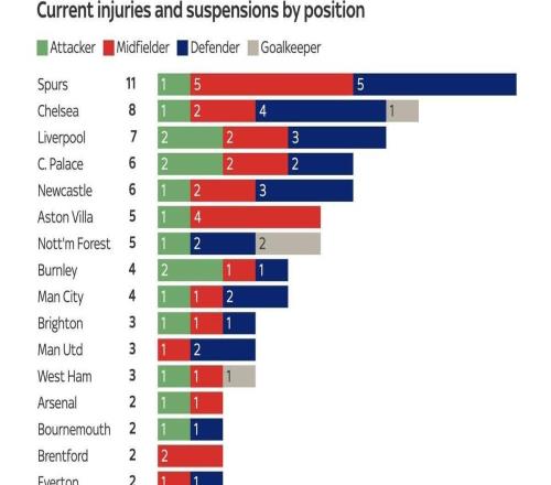 热刺当前11人受伤为英超最多,阿森纳仅2人伤停